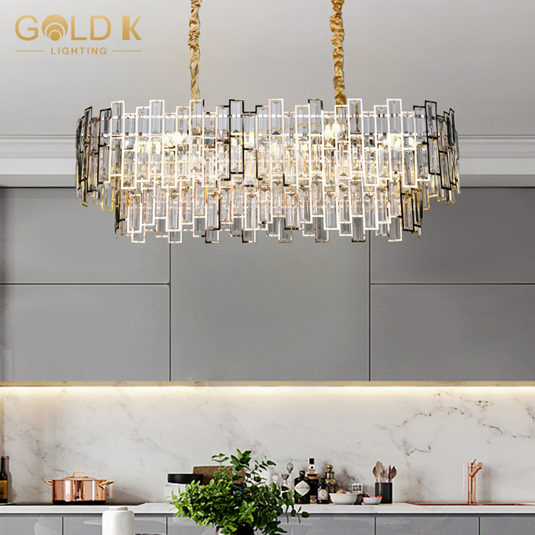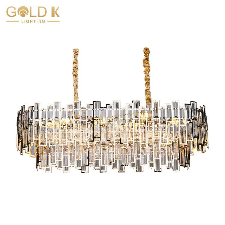 هذا الثريا البلورية البيضاوي المزدوجة مصنوعة من الحديد والكريستال. اللون هو الذهب الفرنسي ومصباح المصباح مصباح LED. عندما يمر الضوء عبر البلورة ، ينكسر الضوء ويعكس داخل الثريا ، مما يعزز تأثير الإضاءة للثريا ويضيء غرفة المعيشة بأكملها.