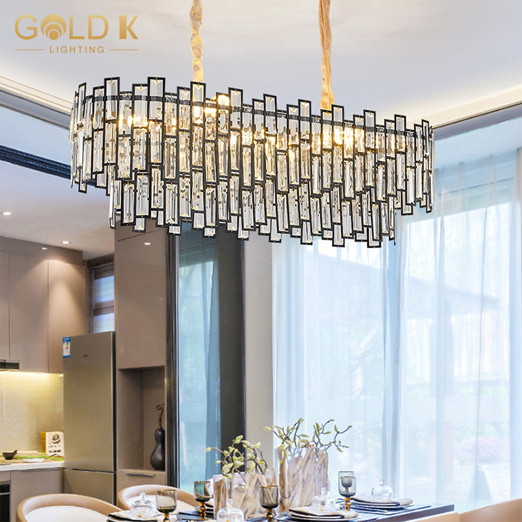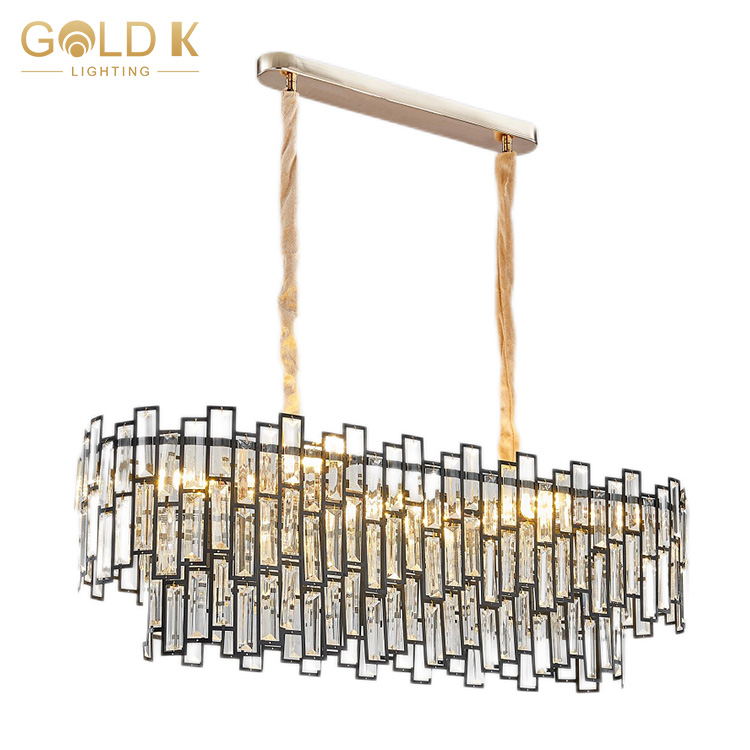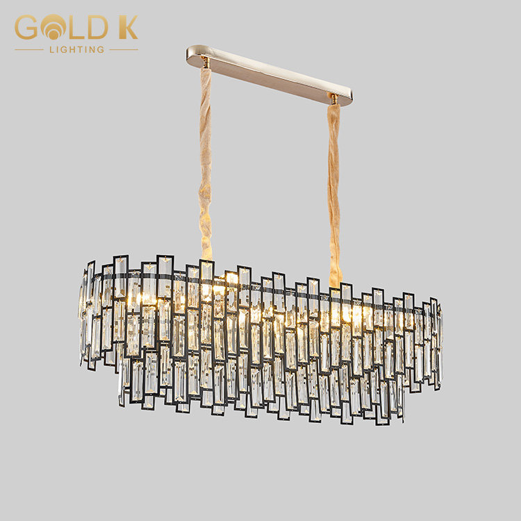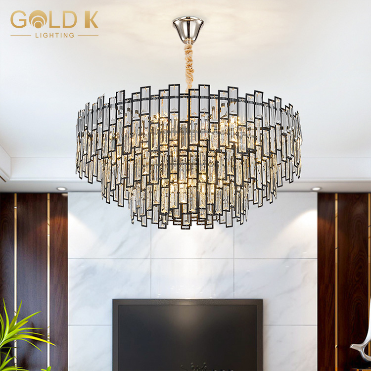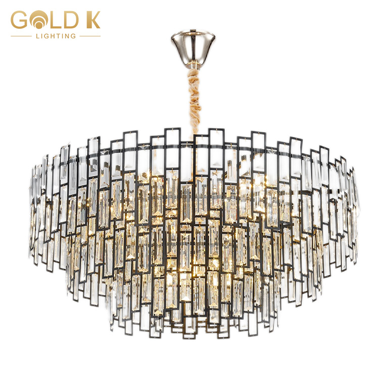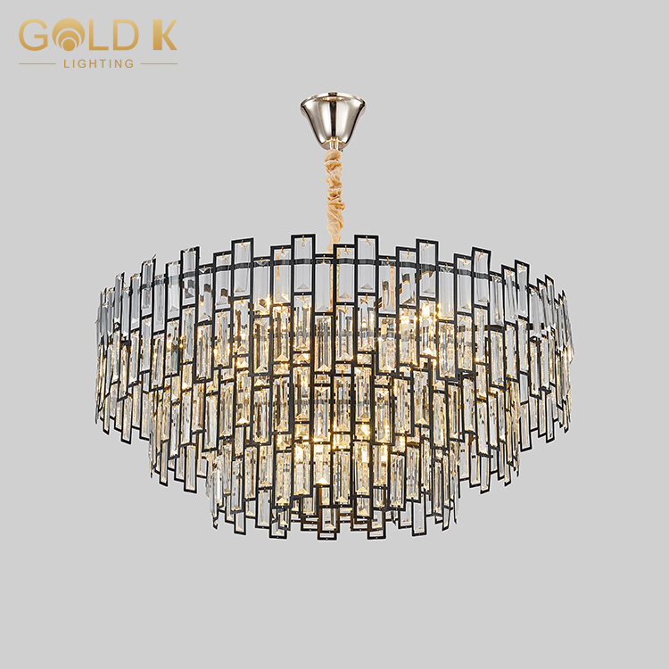 هذا جولة الكريستال الثريا، جسم المصباح مصنوع من بلورة شفافة ، مع ثلاث طبقات من البلورة ، قاعدة المصباح هي مادة معدنية ذهبية. يستخدم مصدر المصباح لمبات LED ، وهي مصابيح صفراء دافئة ، ويختلف عدد المصابيح المطلوبة للأشكال المختلفة. النمط الهندسي على جسم المصباح يجعل المصباح يبدو أكثر عصرية وحديثة.