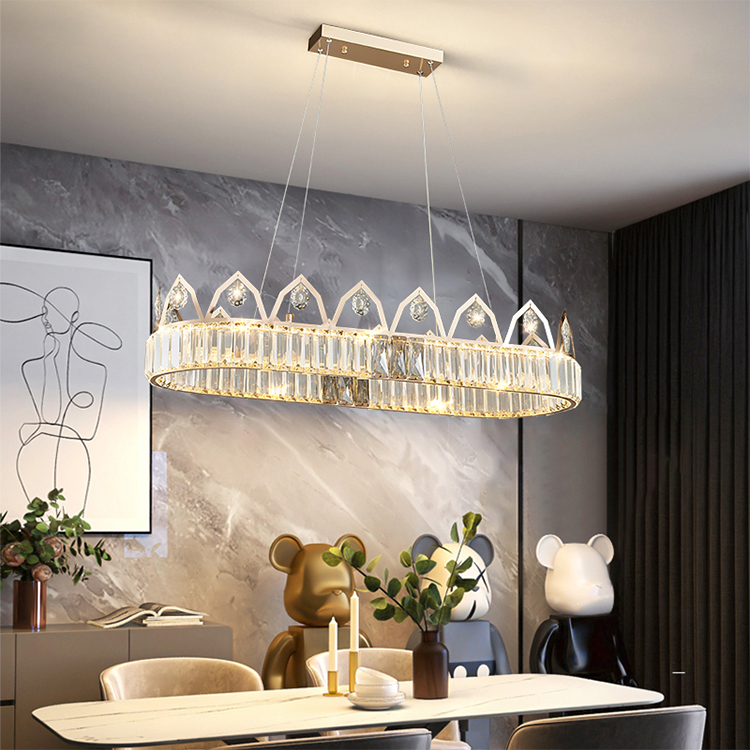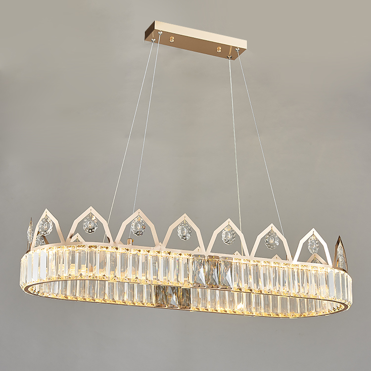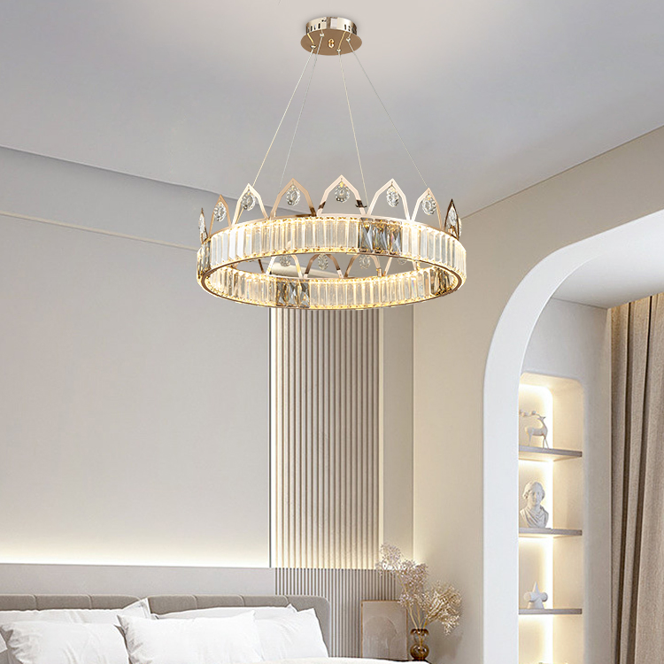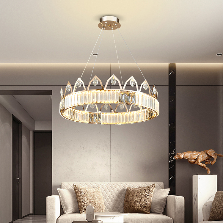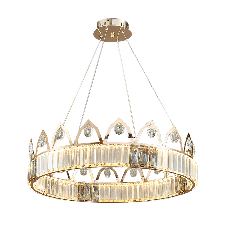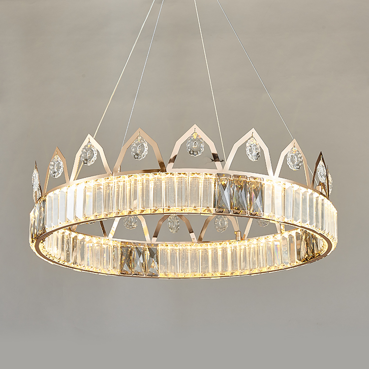 إن تصميم ثريا التاج هذا مستوحى من التاج ، وهو رمز للقوة الملكية. يقدم جسم المصباح دائرة مثالية ، مثل تاج العاهل القديم ، مع تسليط الضوء على الكرامة التي لا تضاهى وجاذبيتها. بالإضافة إلى ذلك إلى البلورة المرفقة على حافة الحلقة ، تم تزيين الزخرفة فوق الحلقة أيضًا بلورات صغيرة.