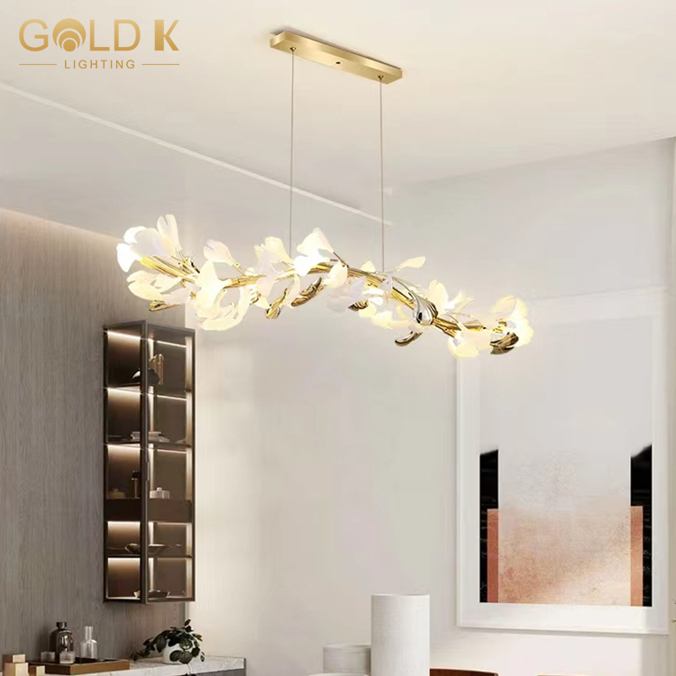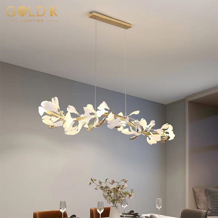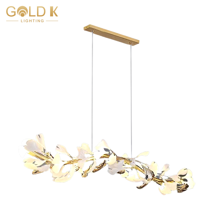 هذه الثريا على شكل ورقة لديها تصميم فريد ومليء بالفن. يتشكل عاكس الضوء بأوراق فنية ، حساسة وواقعية ، مما يمنح الناس شعورًا بأنهم في الطبيعة. لا يوفر ذراع المصباح الذهبي والقاعدة دعمًا مستقرًا للثريا فحسب ، بل يضيفان أيضًا مزاجًا نبيلًا إلى التصميم بأكمله. جزء حامل المصباح مصنوع من مواد بيضاء وشفافة ، مما يجعل الثريا بأكملها أكثر مرونة ومليئة بالحيوية. لا شك أن هذه الثريا هي أفضل خيار لتزيين المنزل بحيث تقوم غرفتك على الفور بترقية الذوق.