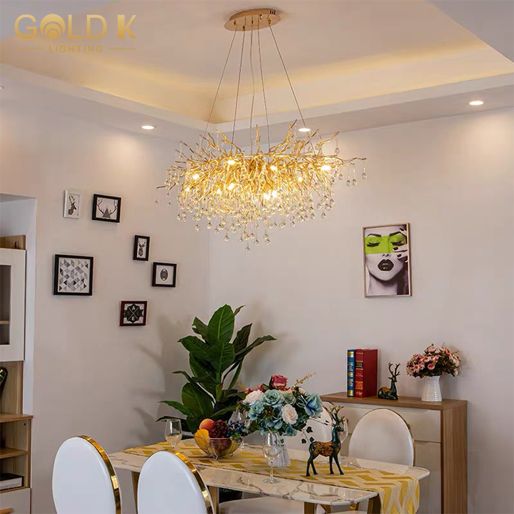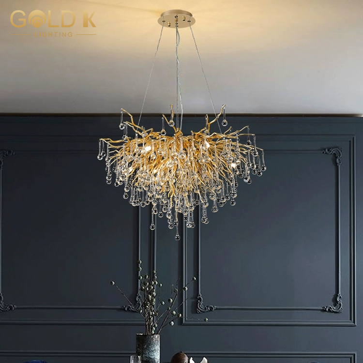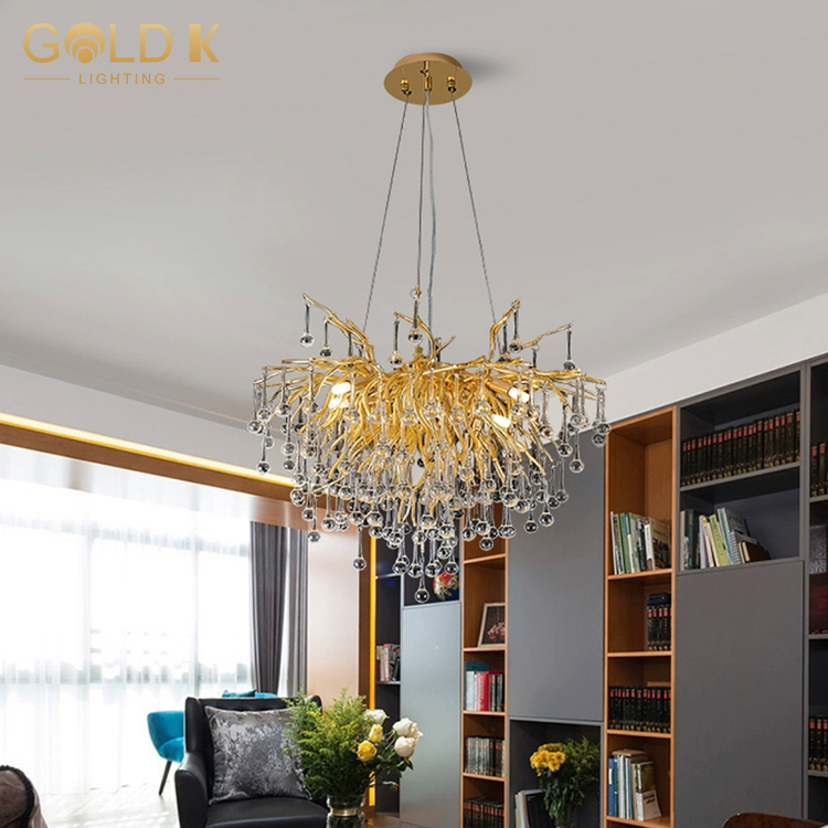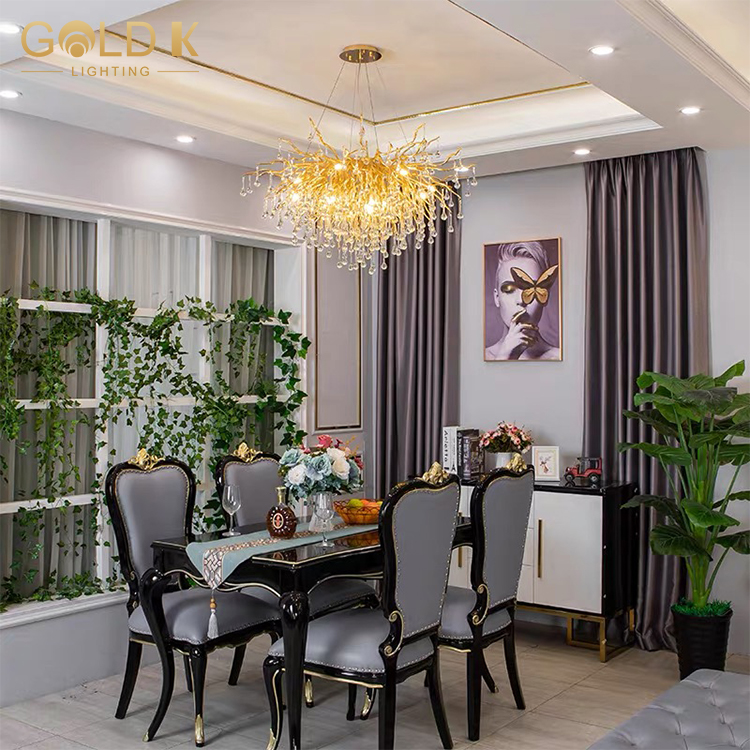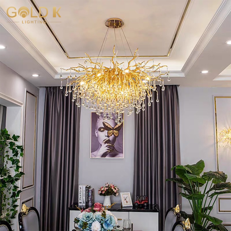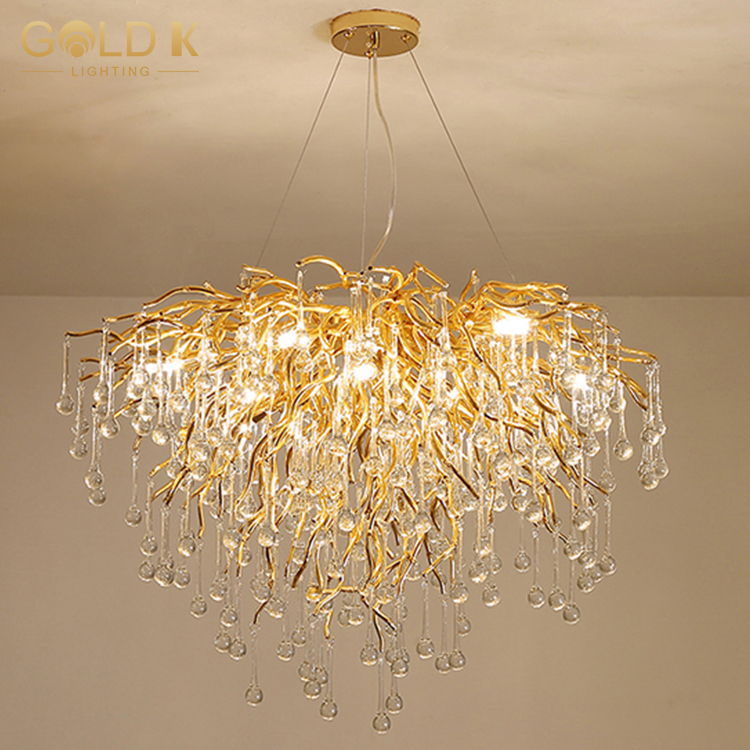 تتكون هذه الثريا من قاعدة مصباح ذهبية على شكل فرع وقطرات المطر البلورية التي لا حصر لها. حامل المصباح مصنوع من الألومنيوم ويتم تصميمه بعناية وصقل لمنحه مظهرًا جميلًا ومتينًا. أسلوب هذه الثريا مناسب للديكور المنزلي الحديث وتزيين الفندق الداخلي. إنها ثريا ممتازة للغاية.