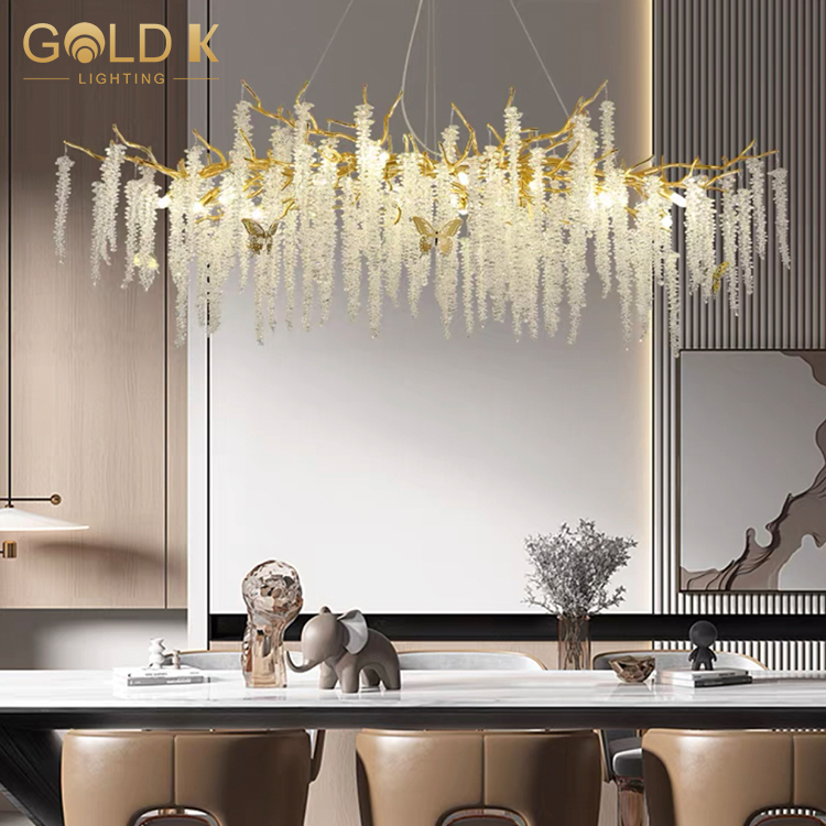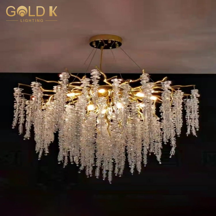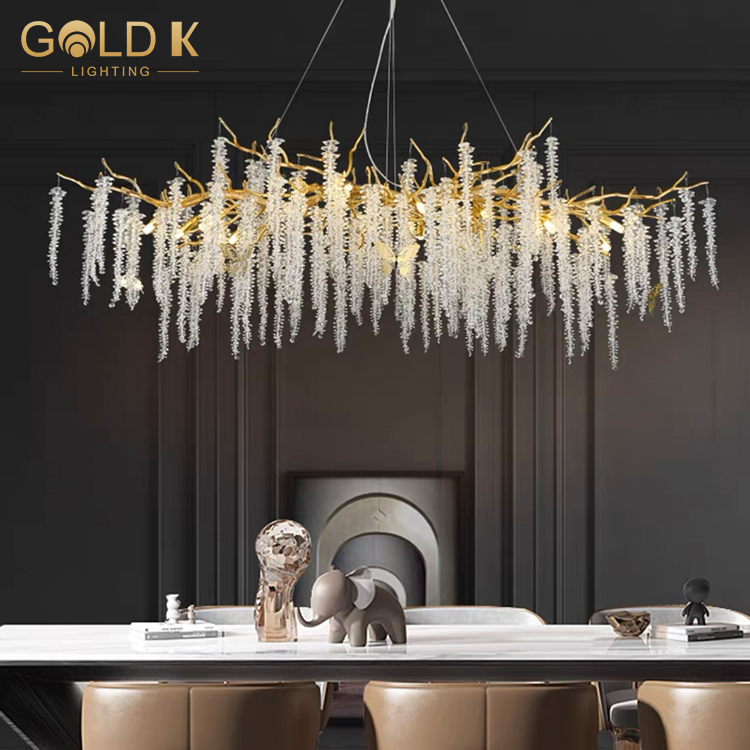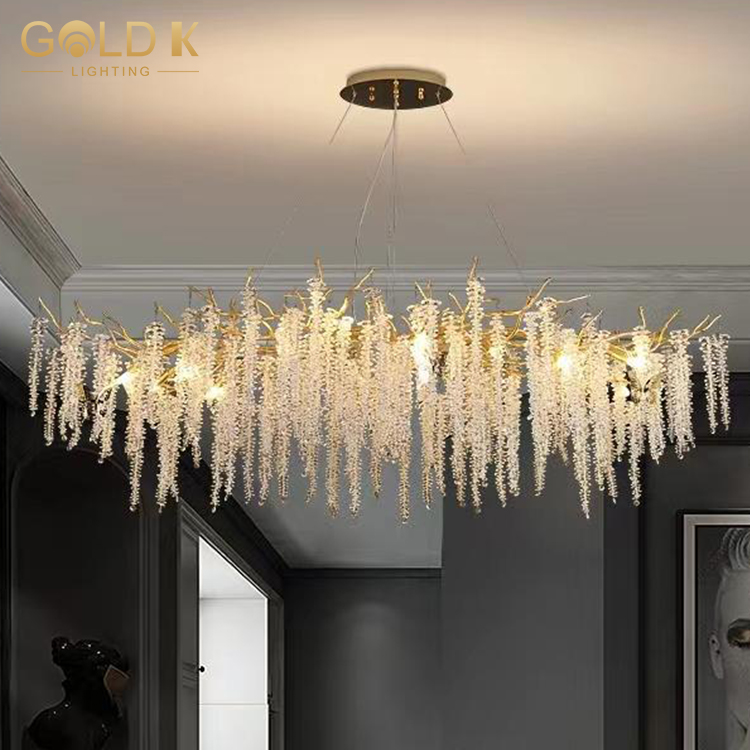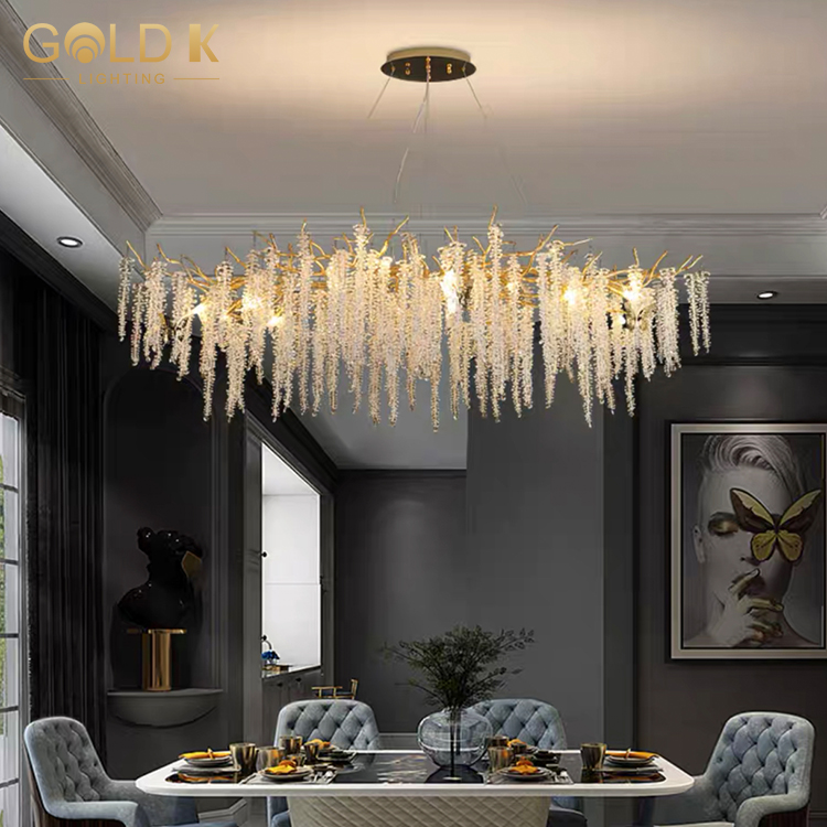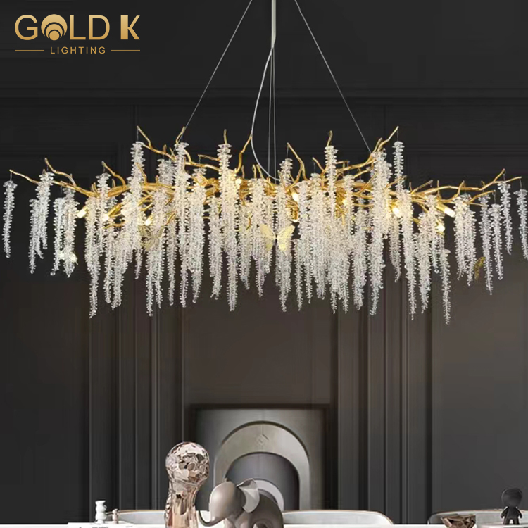 تتبنى هذه الثريا أسلوبًا حديثًا وبسيطًا ، مع فروع مصنوعة من المعدن الألمنيوم ، ويصنع عاكس الضوء من مادة بلورية ذات شفافية عالية ، مما يجعل الثريا بأكملها تبدو أكثر شفافية. ترتبط البلورات لتشكيل سلاسل جميلة من الأضواء. هناك مصابيح كهربائية متصلة على حامل المصباح. تحت إضاءة الضوء ، ستنبعث هذه البلورات ضوءًا ساحرًا ، مما يضيف مزاجًا نبيلًا وأنيقًا إلى الغرفة.