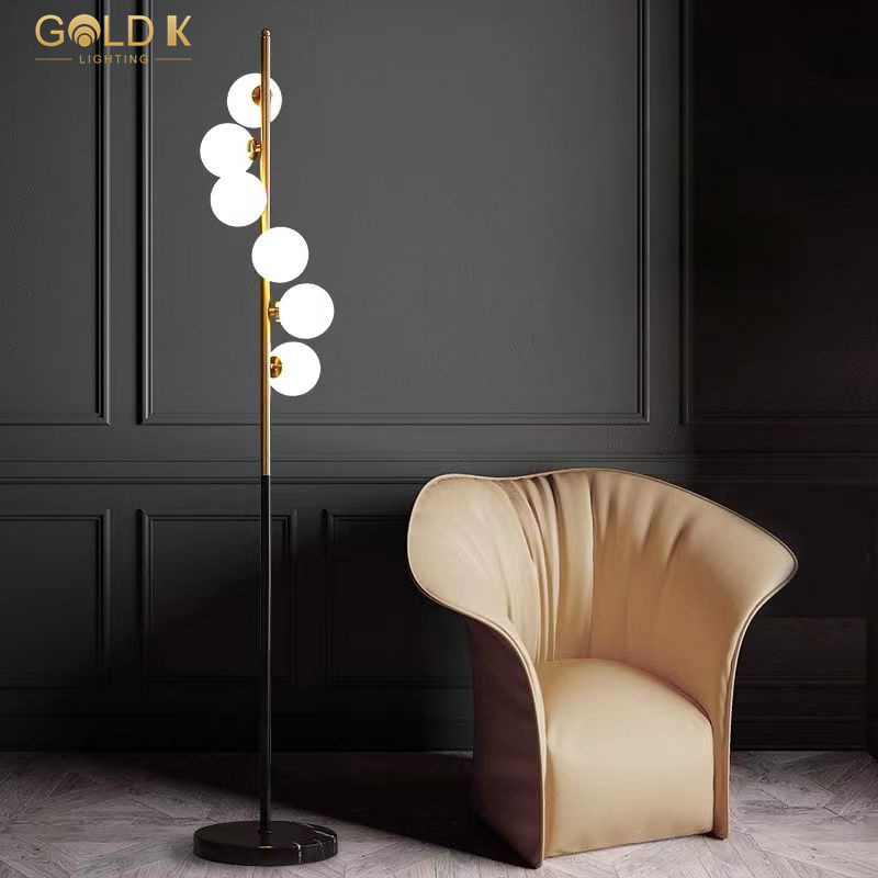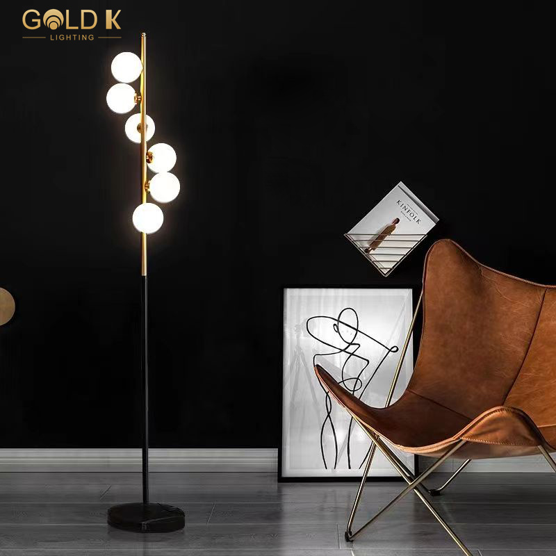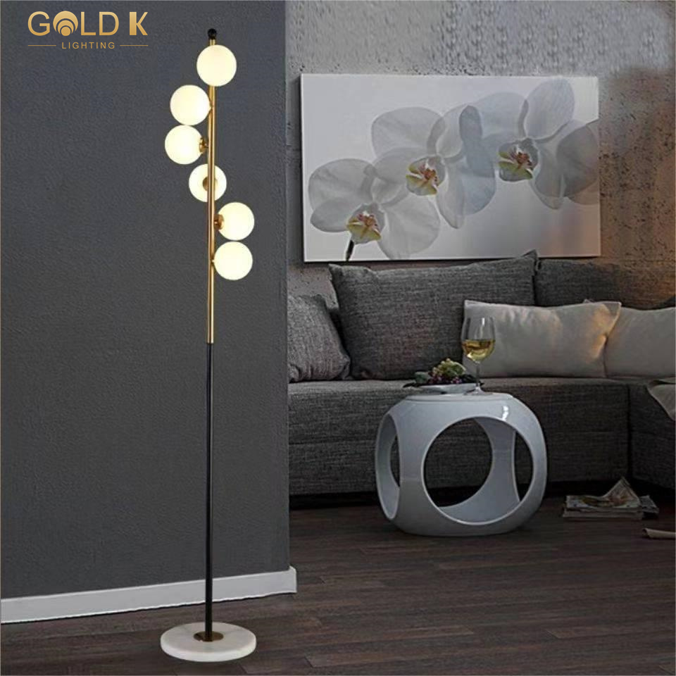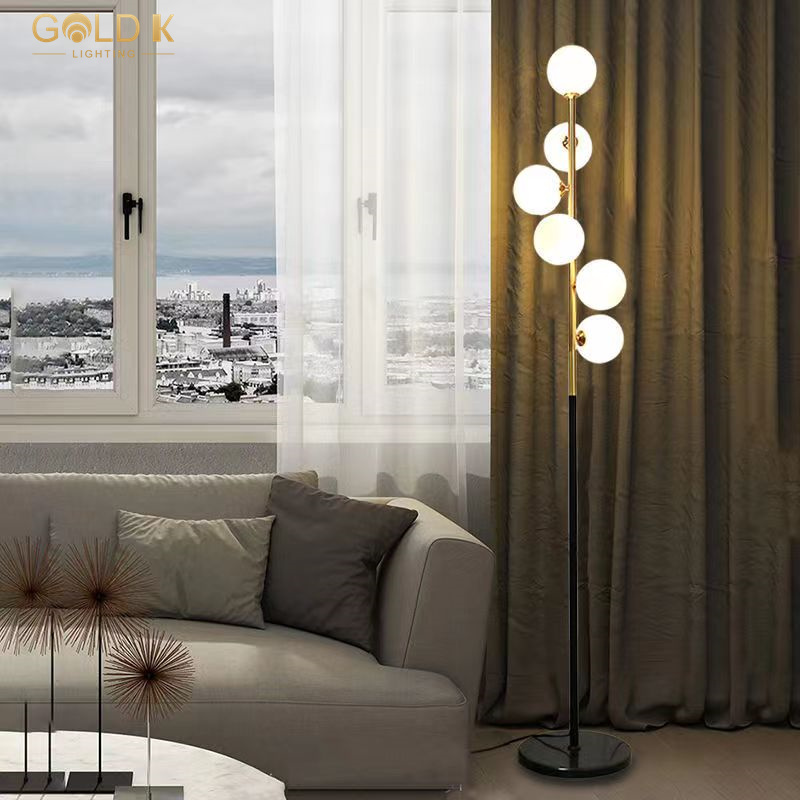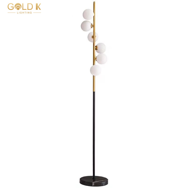 يتكون مصباح الأرضية الزجاجية المستديرة من قاعدة رخامية مع أعمدة ذهبية وسوداء ، ويتم تعليق ستة حاجب أبيض مستدير عليها. الأعمدة مصنوعة من الحديد وتبادل الضوء مصنوع من الزجاج. ويستخدم مصابيح LED. من خلال اختبار الجودة الصارم والتحكم الفني ، تأكد من أن كل مصباح أرضي يمكنه تحقيق أعلى جودة.