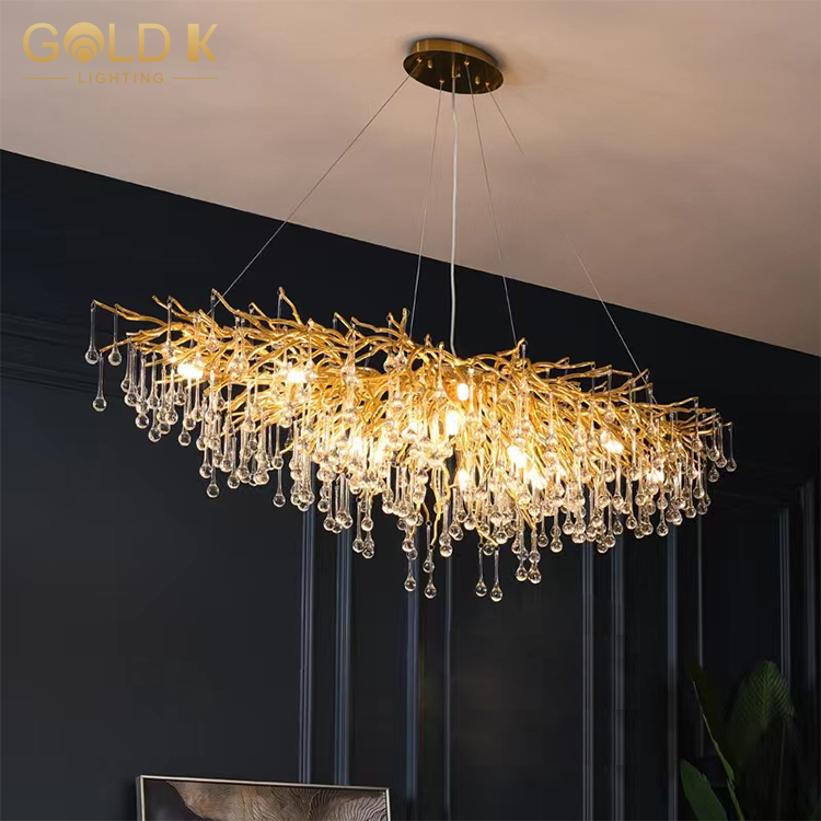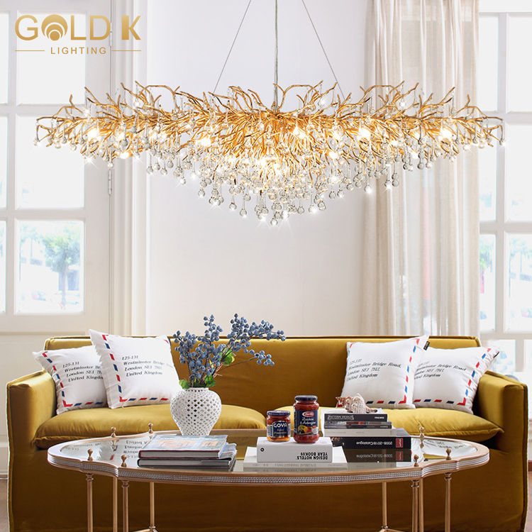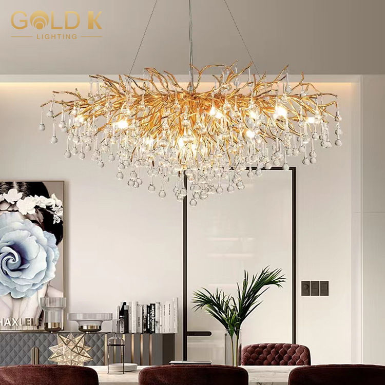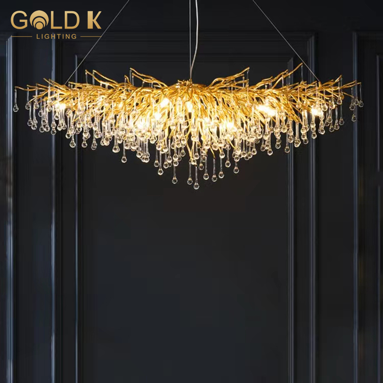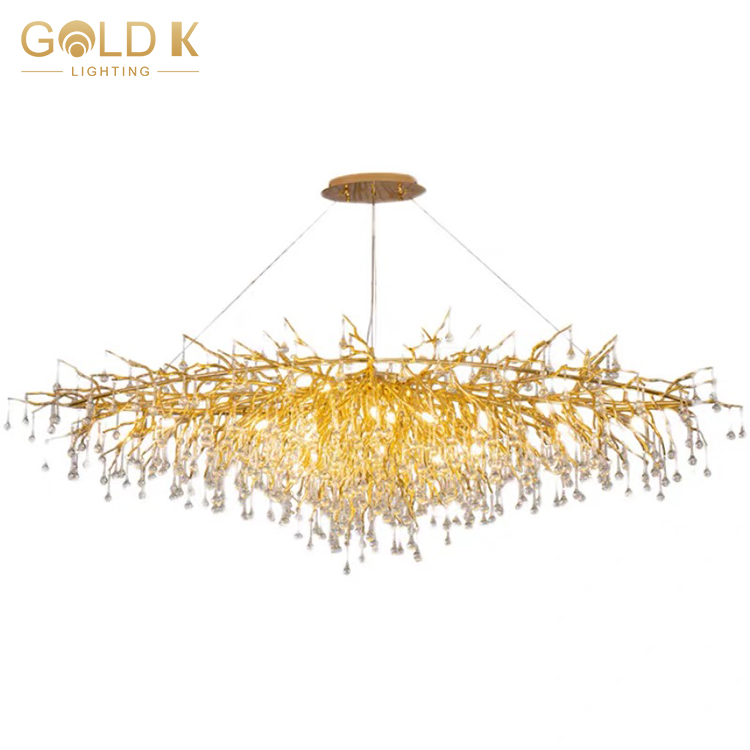 هذه الثريا الذهبية تتشكل مثل فرع الأشجار. الكل ذهبي ، والفروع مصنوعة من الألمنيوم. قلادة مع بلورة زجاجية صغيرة ، مما يجعل الثريا بأكملها أكثر مرونة ، ومليئة بالحيوية. أسلوب تصميم هذه الثريا هو أسلوب بسيط حديث ، مناسب للتركيب في غرفة المعيشة والفندق والأماكن الراقية الأخرى.